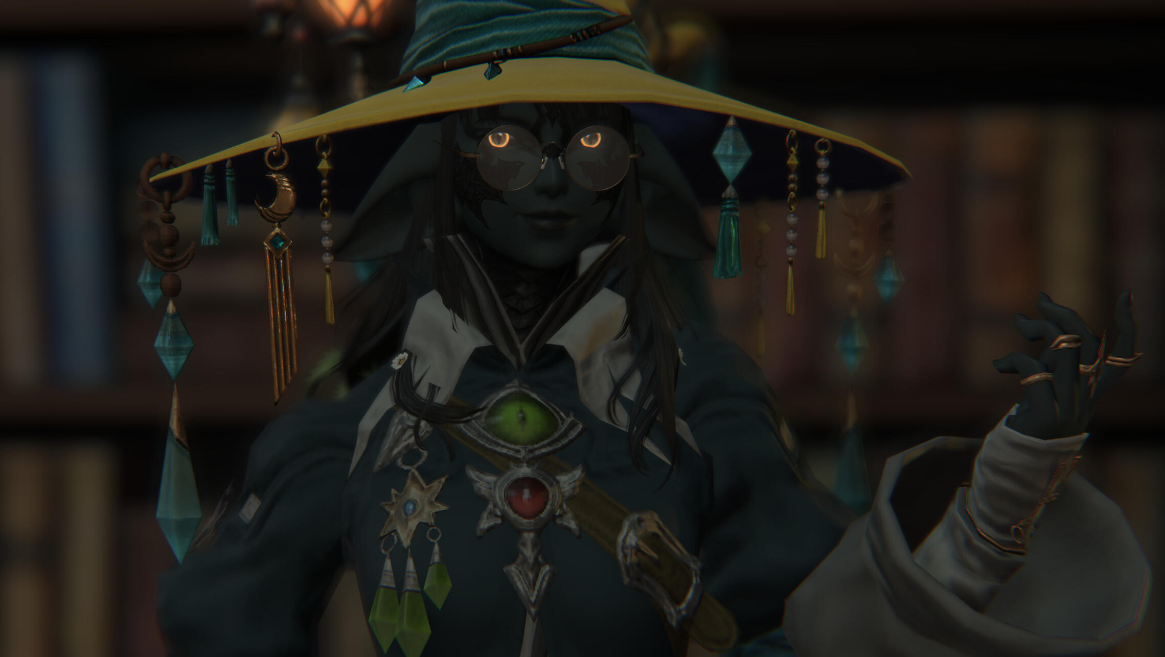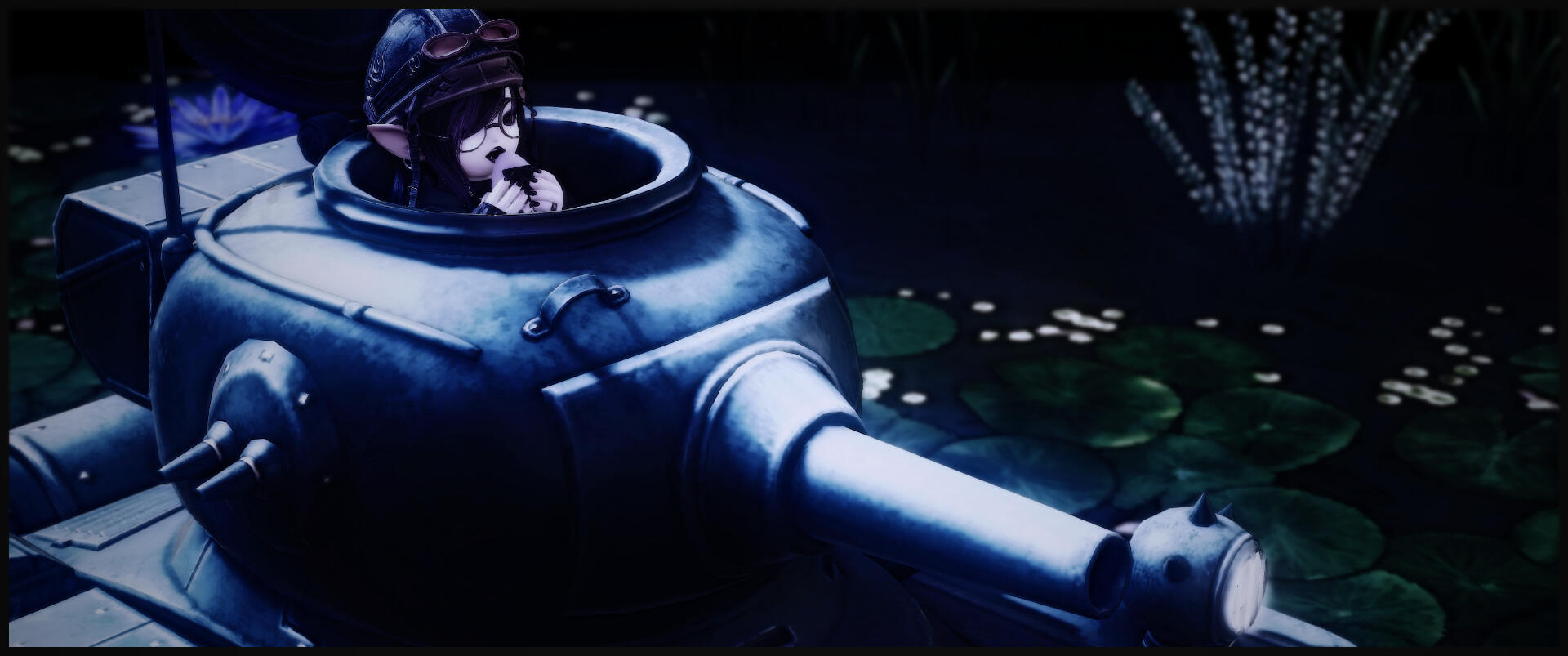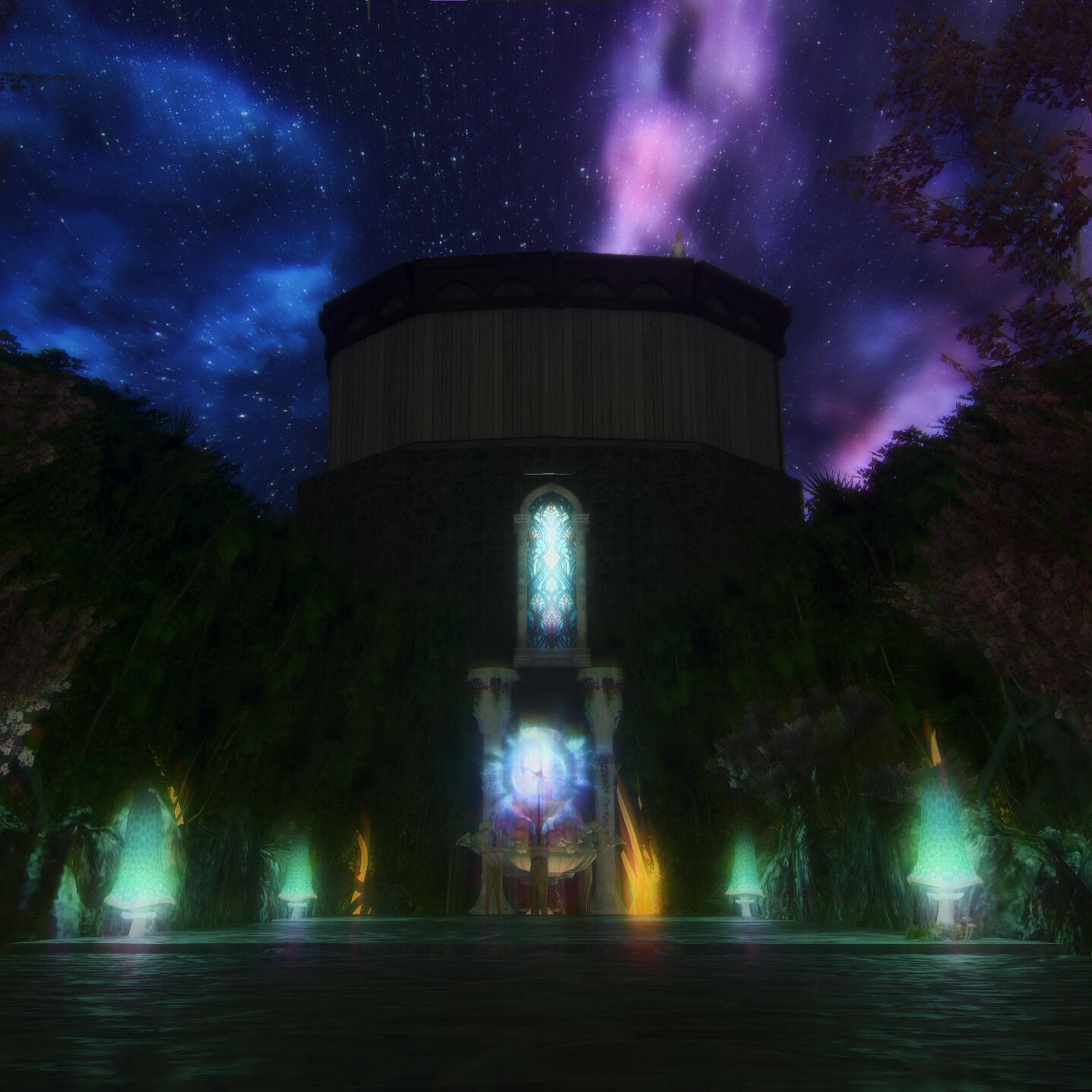Deep within a dense, dank swamp resides a massive wizard's tower, where Amanita keeps not just her massive library of history books and grimoires, but also her stash of magical artifacts. This tower resides in the remnants of her home in the Nachtlands, part of the Kingdom of Selene, which floats adrift in the aetherial sea after calamity befell the Sixth Shard. Amanita's main way of accessing it is either via direct teleportation by focusing on the orb in the courtyard as a central waypoint, or via a magical painting inside her cabin tucked deep in The Black Shroud.The waters of the swamps grant healing properties in their deceptively murky depths. By bathing in the waters, one will heal wounds, cure themselves of disease, and ail afflictions that may be discomforting them. The animals that reside in the swamps are entirely harmless, although there are several gargoyles that fly around the swamp acting as sentries for potential intruders, if someone were to manage to get into her dimension.The wizard tower hidden in the deep swamp is where Amanita has made her official home. It is a several story wizard tower that spans above the treeline, the tallest floor granting a view of the eternally nightsky. Inside contains multiple floors of vast libraries containing books on history of several worlds she's visited, many, many grimoires and tomes, as well as personal journals accounting portions of her life. The top floor, protected by several wards that trigger without Amanita's staff in hand, is her personal sanctuary. The roof is see through from the inside, granting a view of the everlasting night sky, and along the floor are flowers from her lost homeworld. Dotting the walls are grimoires and history books recovered from her and a group of the scions revisiting her lost world, after Endsinger was defeated and the Final Days halted.